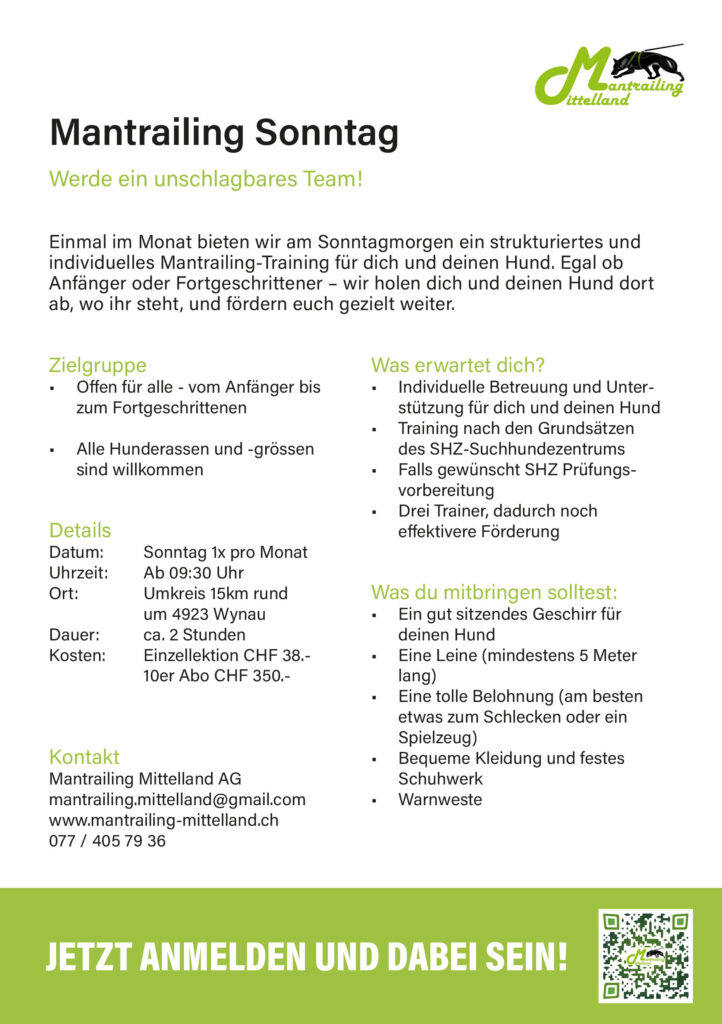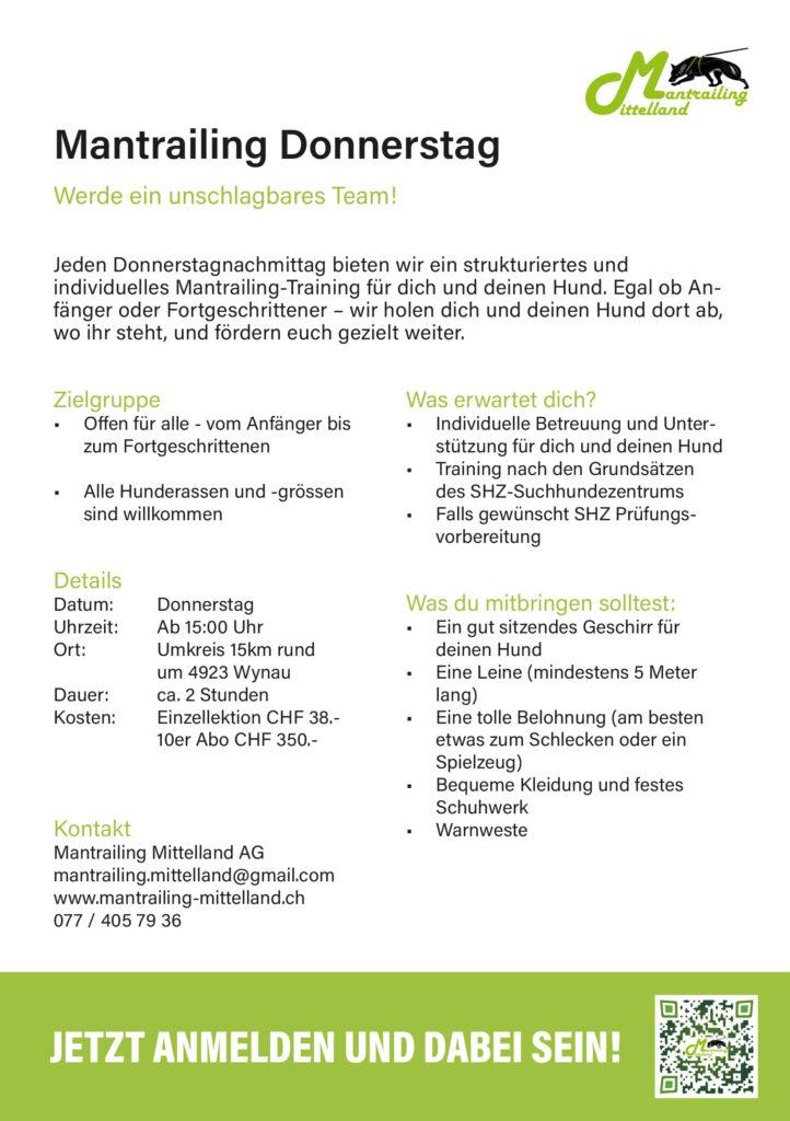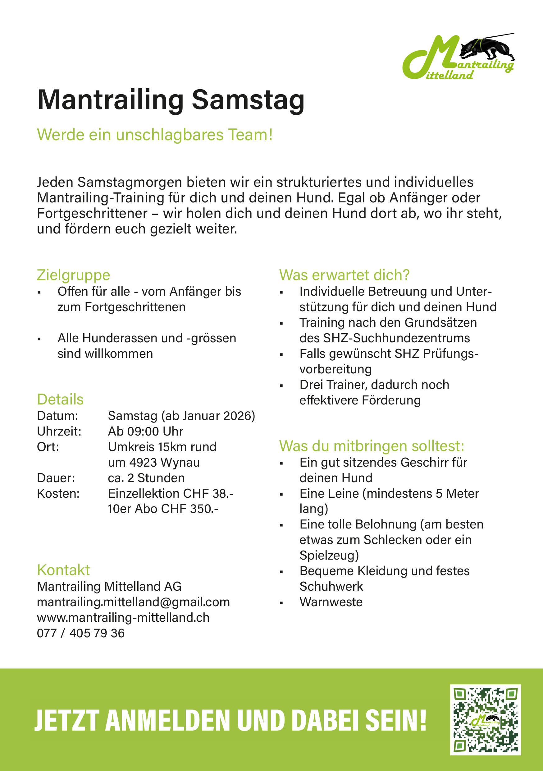 Mehrmals pro Woche kannst du mit deinem Hund an unserem strukturierten und individuellen Mantrailing-Training teilnehmen. Vom ersten Trail bis hin zur anspruchsvollen Suche – wir begleiten euch mit Freude und Fachwissen.